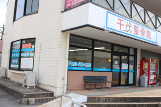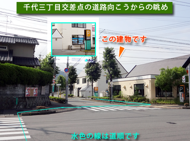 坂道を上り始めてすぐの「千代三丁目交差点」を右折するとすぐ右手にショッピングパーク千代の入り口があり、入口を入って左側が当院です。